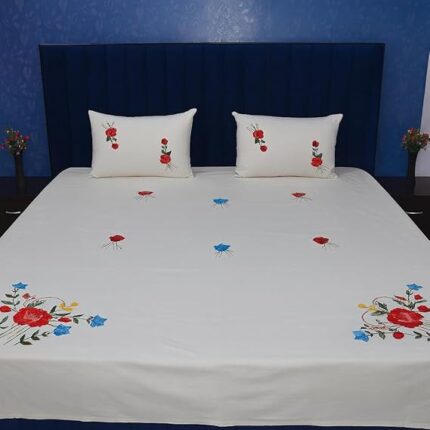 Swadha Romantic Heart Embroidered Cotton Double Bedsheet Set with 2 Pillow Covers, White and Red, Handcrafted Design for Wedding and Bedroom Decor
