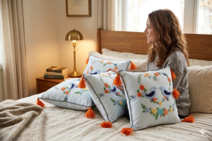 Handcrafted Embroidered Cushion Covers with Bird & Floral Design | Decorative Throw Pillow Covers with Tassels | Boho Home Décor